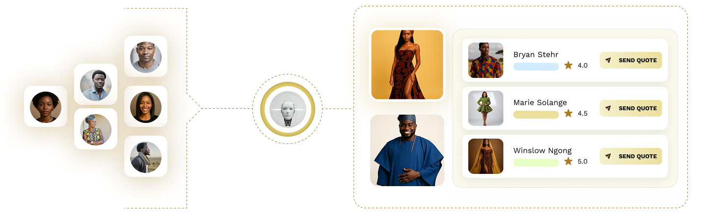 Whether it's a wedding dress, agbada, or modern blazer, use AI to turn your fashion ideas into detailed design sketches. Receive quotes from professional tailors and bring your vision to life.
